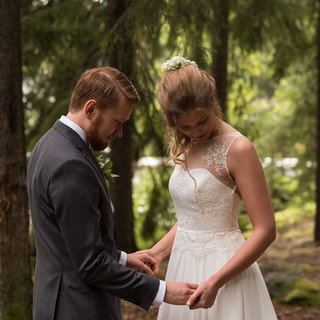 Aloitin oman kuvauspäiväni morsiamen valmistautumisen viime minuuttien kuvaamisesta hänen lapsuudenkodissaan. Saara ja Sakke tapasivat toisensa hääpäivänä ensimmäisen kerran first look -kuvauksessa, josta jatkoimme potrettien kuvaamisella. Pientä jännitystä oli ilmassa, mutta se haihtui nopeasti, kun kuvaaja kaivautui kuusikkoon ja pyöri maassa.
